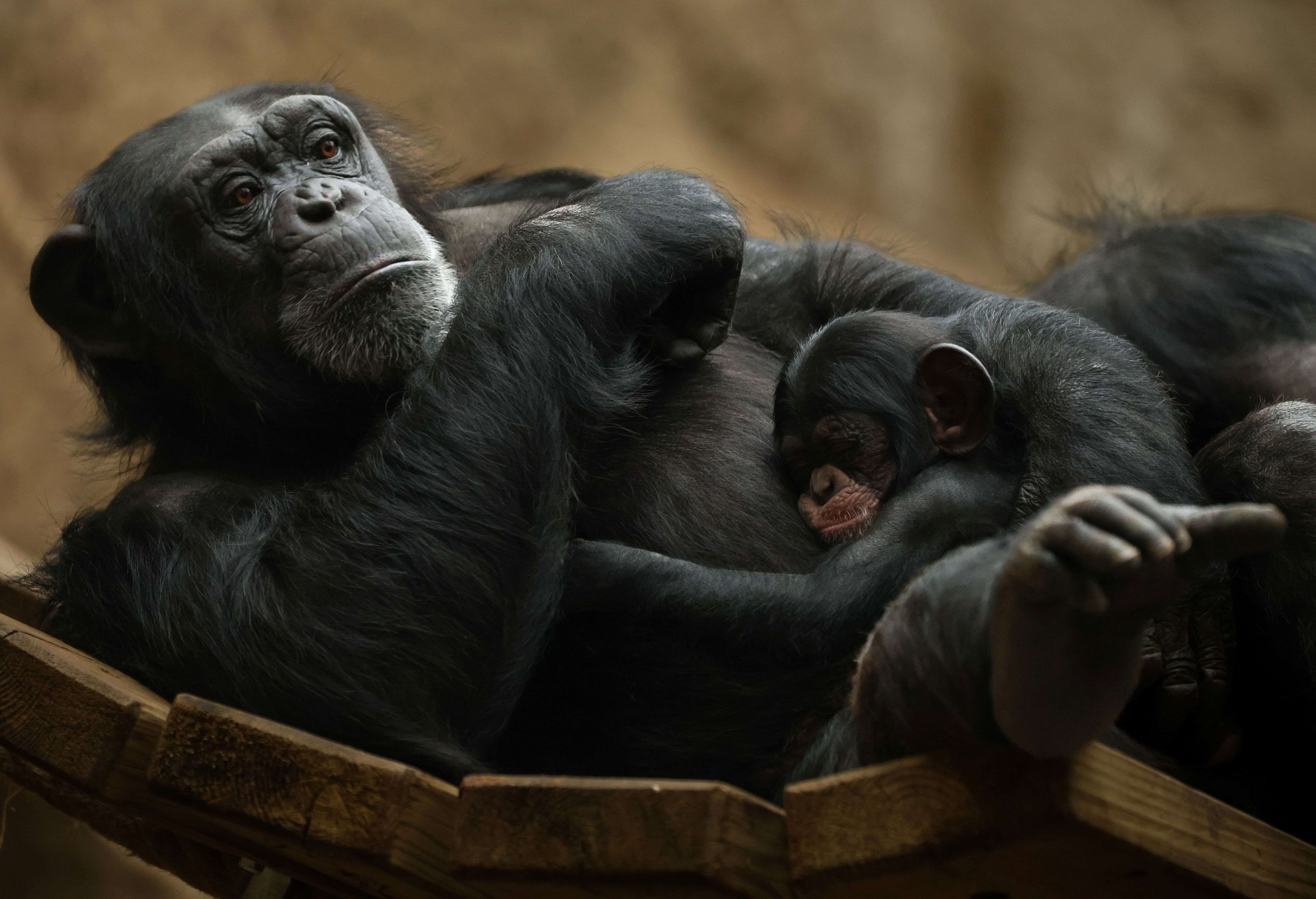 Am Samstag, den 31. Januar wuchs die Schimpansenfamilie am Schölerberg: Nach rund acht Monaten Tragzeit brachte Weibchen Vakanga ein Jungtier zur Welt. „Die Geburt fand in den Nachmittagsstunden statt und konnte sowohl von uns Tierpflegern als auch von Besuchern beobachtet werden“, berichtet Bejamin Müller, Revierleiter im Zoo Osnabrück. „Vakanga kümmert sich aufmerksam um das Jungtier, dem es gut geht. Eine tierärztliche Untersuchung kann und sollte allerdings – wie immer bei den Schimpansen – nicht durchgeführt werden, um die enge Bindung zwischen Mutter und Jungtier nicht zu stören“, erklärt Laura Sieckmann, Veterinärin und Kuratorin im Zoo Osnabrück. Somit müssen sich Tierpfleger, Biologen und Veterinäre zunächst auf ihre Beobachtungen verlassen. Auch das Geschlecht des jüngsten Westafrikanischen Schimpansen wissen sie daher noch nicht. Die meiste Zeit klammert es sich bäuchlings am Bauch der Mutter fest. Meist sehen die Tierpfleger daher zufällig, welches Geschlecht das Jungtier hat, wenn die Mutter es einmal andersherum hält.