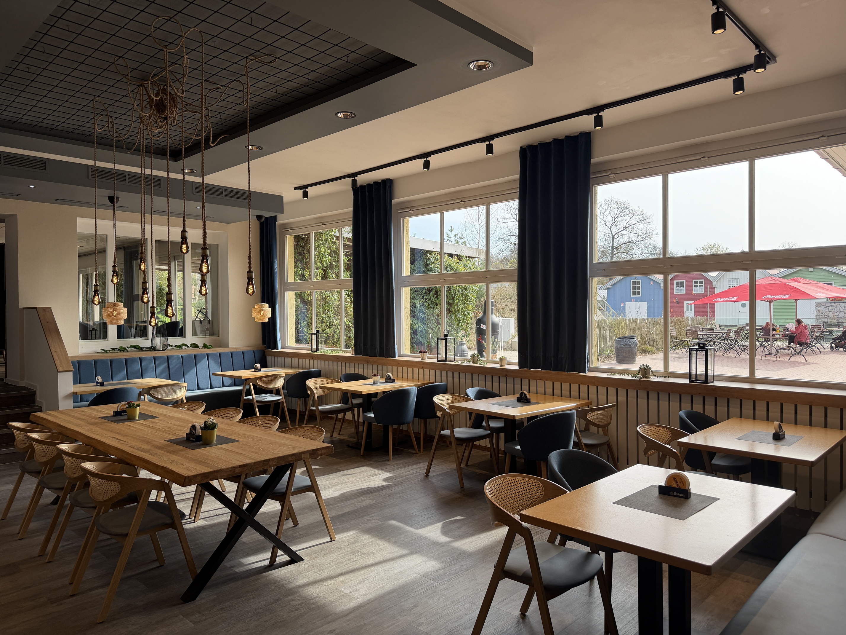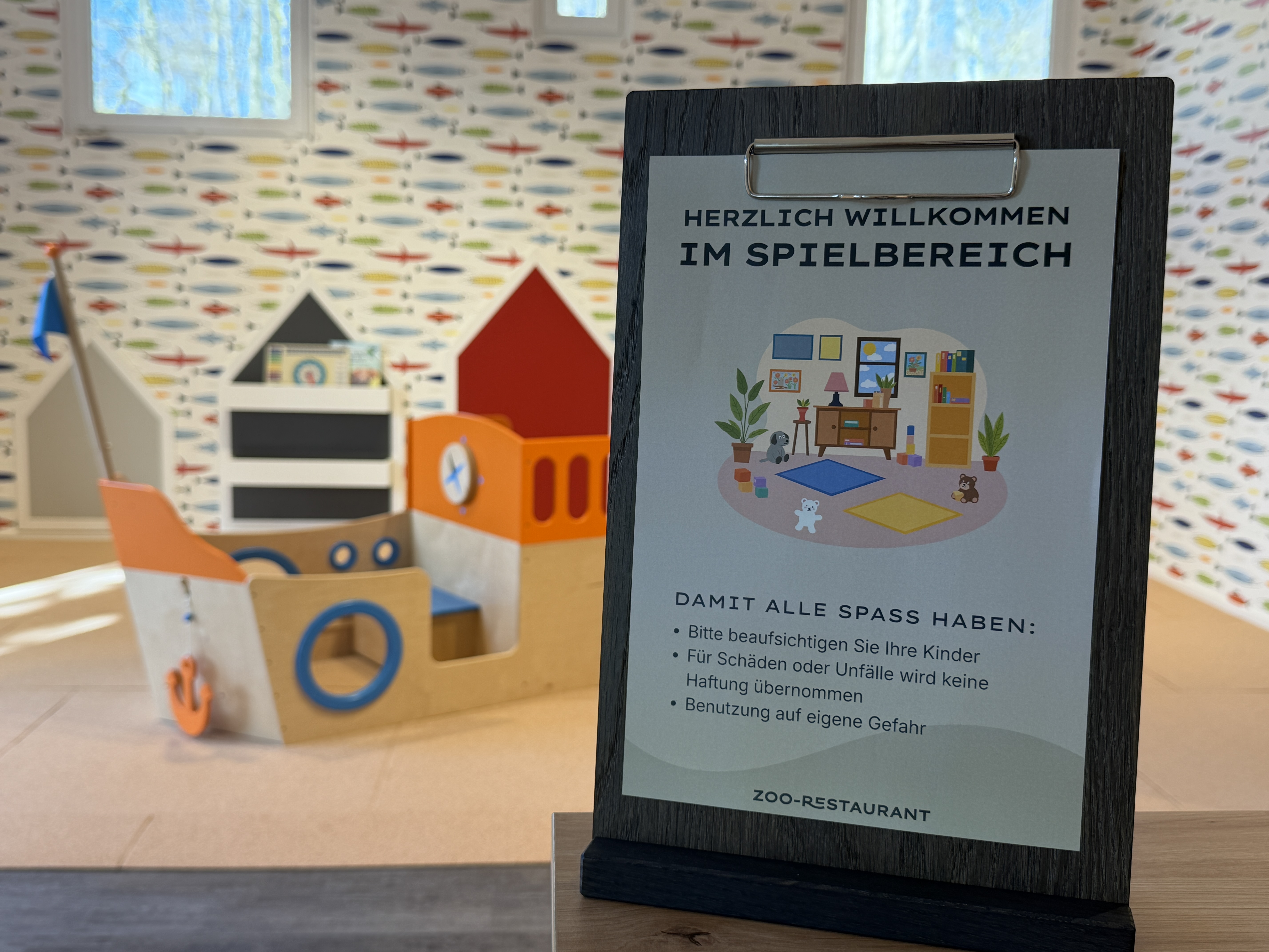 Für die Neugestaltung war es wichtig, Gemütlichkeit mit einem Bezug zu den Wasserwelten Mariasiel zu verbinden. „Als Teil der Wasserwelten haben wir uns von der Nordsee und den nordischen Ländern inspirieren lassen. Unser Restaurant vermittelt Gemütlichkeit und Wohlbefinden. Gleichzeitig haben wir mit verschiedenen Blautönen und Holzarten für maritimes Flair gesorgt“, erläutert Zoo-Architekt Robert Buss. Neben dem neuen Erscheinungsbild wurden auch die Sanitäranlagen erneuert und um ein behindertengerechtes WC ergänzt. Besonders familienfreundlich ist der neue Spielbereich für Kinder. „Ein Spielbereich für Kinder, eine digitalisierte Speisekarte und ein Veranstaltungsraum, der auch für Tagungen mit modernster Präsentationstechnik ausgestattet ist, sind das Ergebnis der Umbauarbeiten“, erklärt Nico Korte, Bereichsleiter Besuchererlebnis. Auch kulinarisch bringt das Zoo-Restaurant frischen Wind mit sich: Neben Klassikern wie Pommes Frites und Currywurst finden sich nun unter anderem eine Salatbar, hausgemachte Antipasti, Fischbrötchen sowie saisonale Tagesgerichte auf der Speisekarte. Ein besonderer Fokus liegt dabei auf regionalen Produkten; lokale Anbieter sollen gezielt eingebunden werden, um Frische, Qualität und Nachhaltigkeit weiter zu stärken. „Wir möchten unseren Besuchern mehr Vielfalt und Qualität bieten. Von schnellen Snacks bis hin zu frischen, saisonalen und möglichst regionalen Produkten“, berichtet Andreas Szymanski, Betriebsleiter Erlebnis & Genuss GmbH. „Mit den neuen Angeboten schaffen wir zusätzliche Aufenthaltsqualität und entwickeln das Besuchserlebnis im Zoo weiter“, so Nico Korte, Bereichsleiter Besuchererlebnis.